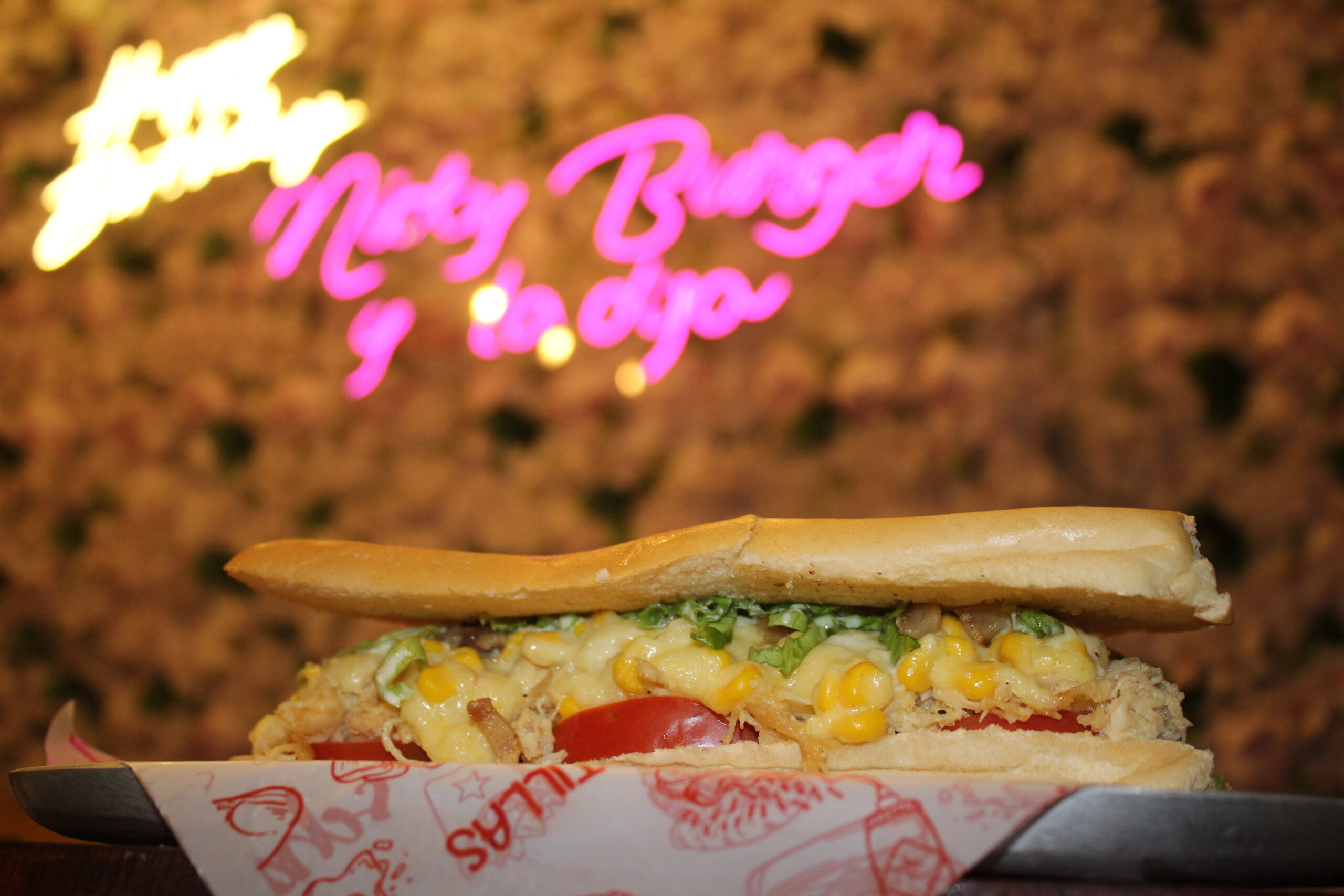 Ingredientes: pan tostado, tocineta ahumada, pollo, lechuga, maíz desgranado, salsa de ajo, piña calada, deliciosos trozos de chicharrón crocante y queso fundido.