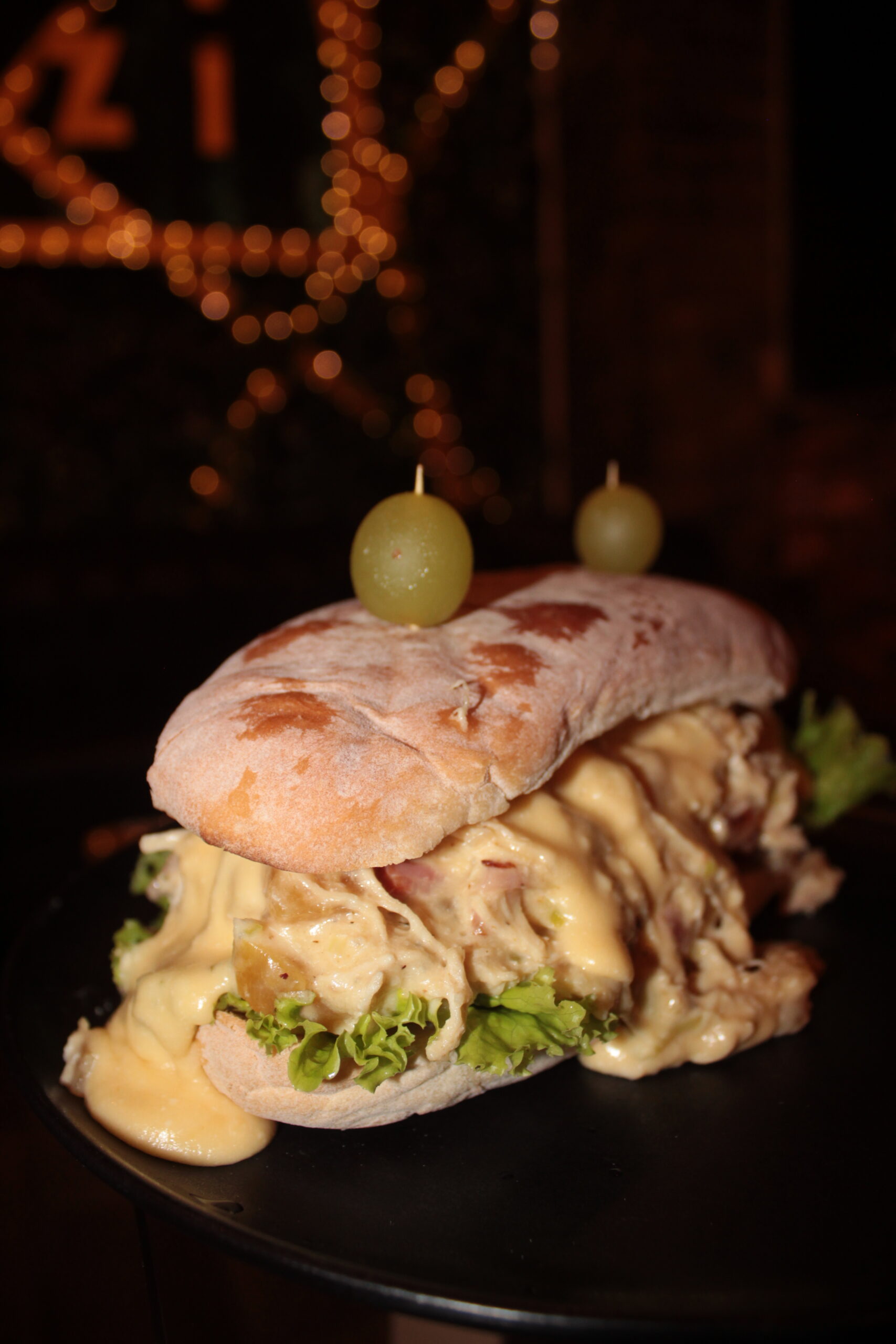 MONTADO SOBRE UN PAN ARTESAL, CON POLLO DESMECHADO AROMATIZADO CON FINAS HIERBAS, ENRIQUECIDO CON SALSA BECHAMEL Y CREMA DE LECHA BAÑADO EN QUESO FUNDIDO Y ADORNADO CON UVAS VERDES. UNA ESPELUZNANTE SANGRIA DE SABORES PARA DELEITAR TU REFINADO GUSTO!!