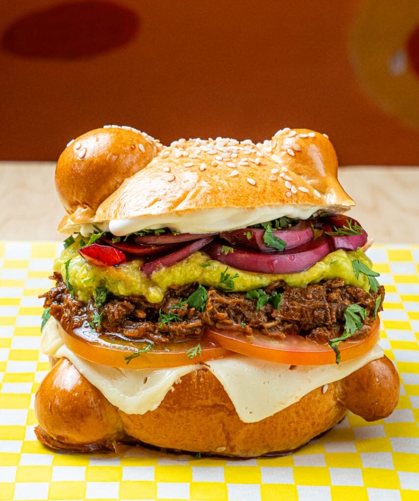 Entre un pan de muerto suave y ligeramente dulce, se esconde un sabor de tradición: birria jugosa, queso doble crema gratinado, guacamole fresco, crema agria, tomate, cebolla encurtida y cilantro.